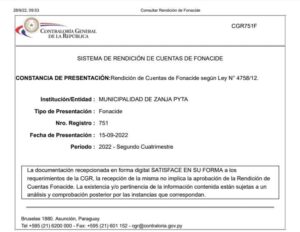 👉🇵🇾 RENDICION DE CUENTAS Publicada en 11 octubre, 2022 por Arte Romero RENDICION DE CUENTAS Presentación de Informe, a la Dirección de Control y Rendición de Cuentas de la Contraloría General de la República, sobre las transferencias de ROYALTIES y FONACIDE, correspondiente al Segundo Cuatrimestre del año 2022. #Zanja Pytã para Todos #LOHACEMOSDECORAZON