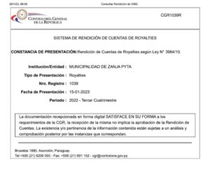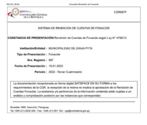 🔶La Municipalidad de Zanja Pytã ha recibido la Constancia de entrega en plazo y forma de la Rendición de Cuentas de Ingresos y Gastos de las fuentes de FONACIDE y ROYALTIES correspondiente al 3er cuatrimestre del 2022 a la Contraloría General de la República.